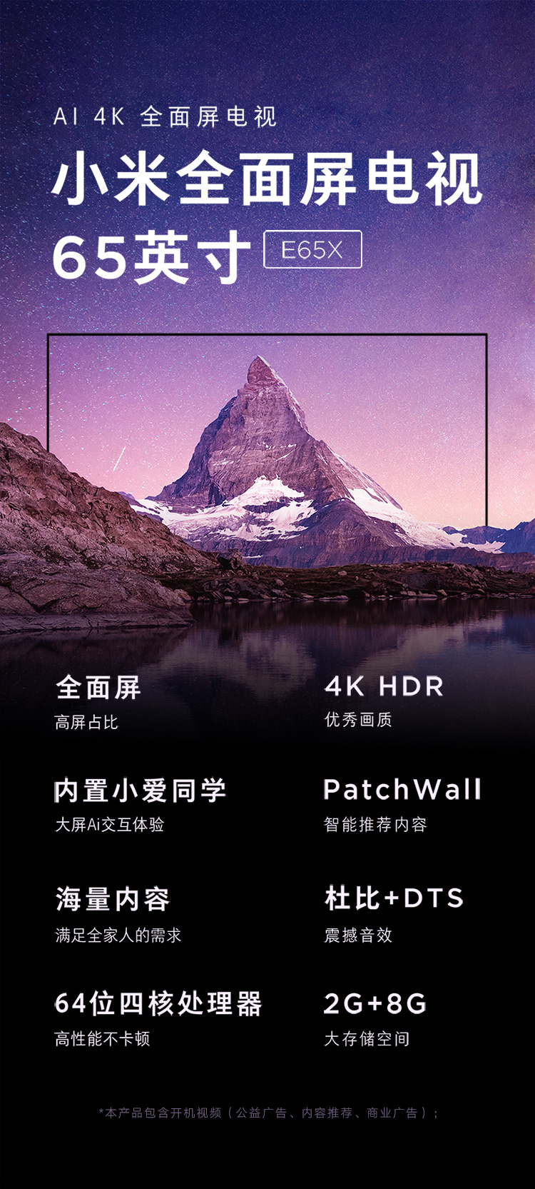 商品名稱:小米(MI)電視E65X 65英寸 全面屏 4K超高清HDR 藍牙遙控內置小愛 2 8GB AI人工智能液晶網絡平板電視 L65M5-EA