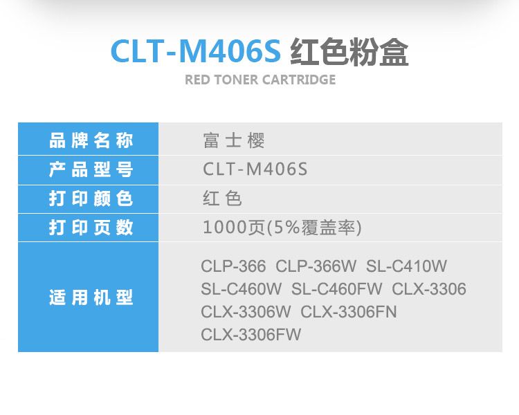 商品名稱:富士櫻(FUSICA)CLT-M406S紅色粉盒 適用三星SL-C410W C460W C460FW CP-366 CP-366W SL-3306/W/FN/FW