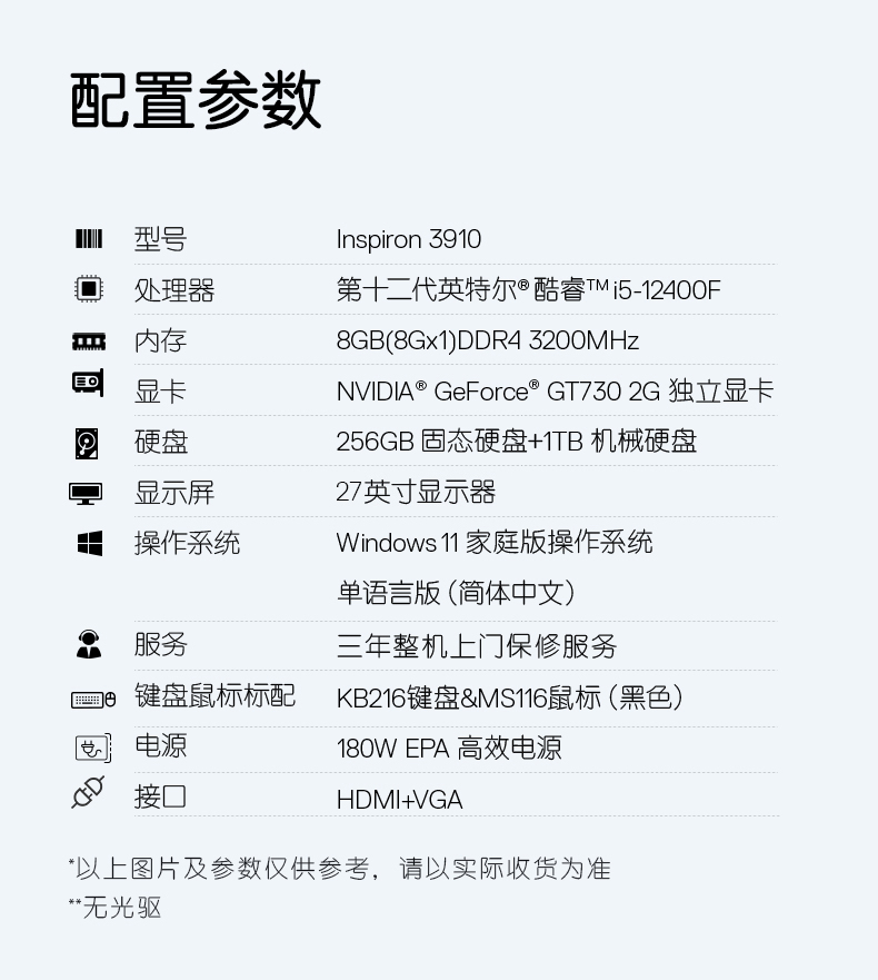 商品名稱:戴爾DELL靈越3910 家用辦公電腦 商務(wù)臺(tái)式機(jī)電腦主機(jī)(12代i5-12400F 8G 256G+1T 2G獨(dú)顯 )27英寸整機(jī)