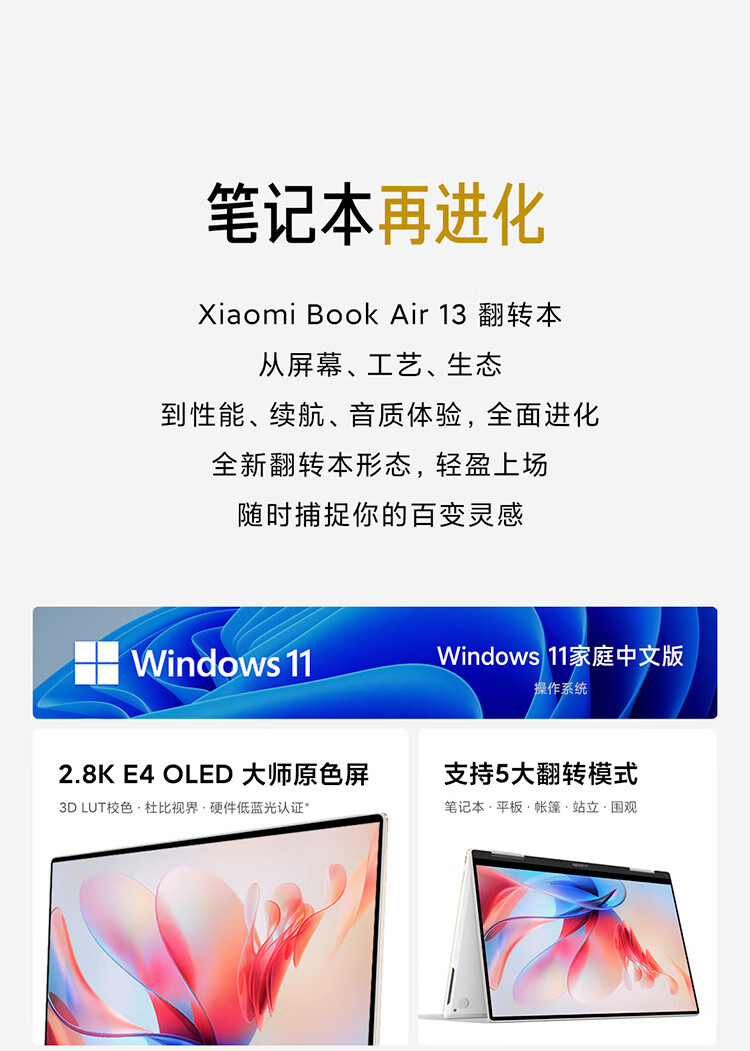 自營小米 Xiaomi Book Air 13 2.8K OLED高清屏筆記本電腦(酷睿i5 16G 512G 翻轉觸控屏 正版office 辦公長續航)