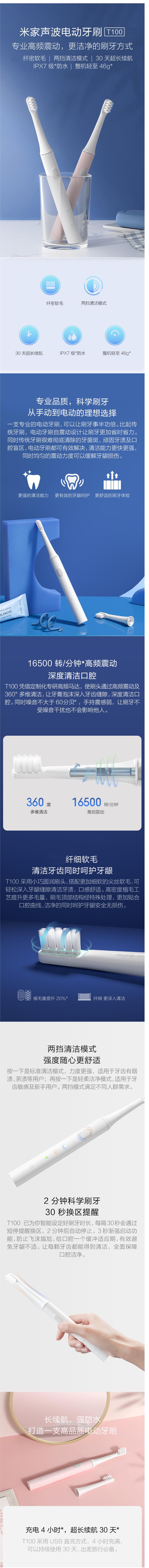 商品名稱:小米 T100 電動牙刷 米家 成人聲波震動 纖密軟毛 30天超長續航 IPX7防水 白色/藍色/粉色