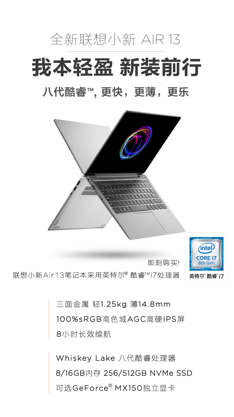自營聯想(Lenovo)小新Air英特爾酷睿i713.3英寸超輕薄筆記本電腦(i7-8565U 16G 512G PCIe MX150 100%sRGB)高定版(黑)